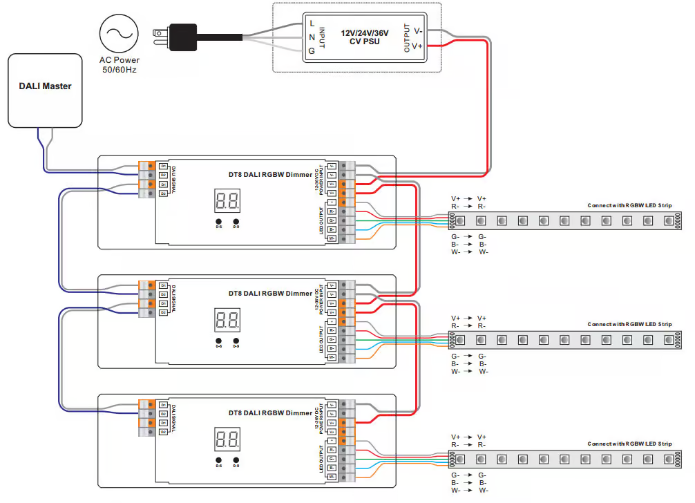 Một địa chỉ ngắn DALI có thể điều khiển đầu ra của nhiều driver LED DT8. Điều này cho phép một kênh duy nhất kiểm soát cả nhiệt độ màu và độ sáng của ánh sáng.