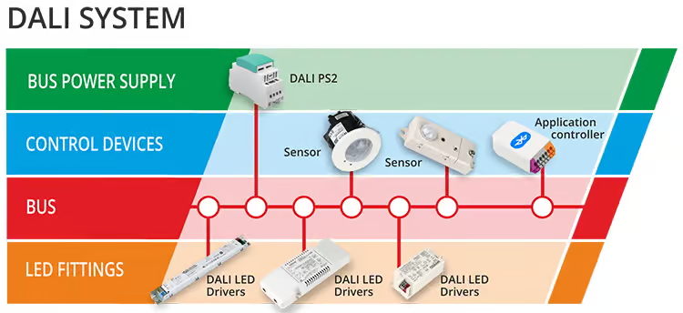 Trong hệ thống DALI, tất cả các thiết bị — từ thiết bị điều khiển, thiết bị phụ trợ cho đến nguồn cấp bus — đều kết nối với nhau thông qua một bus hai dây để trao đổi dữ liệu.
